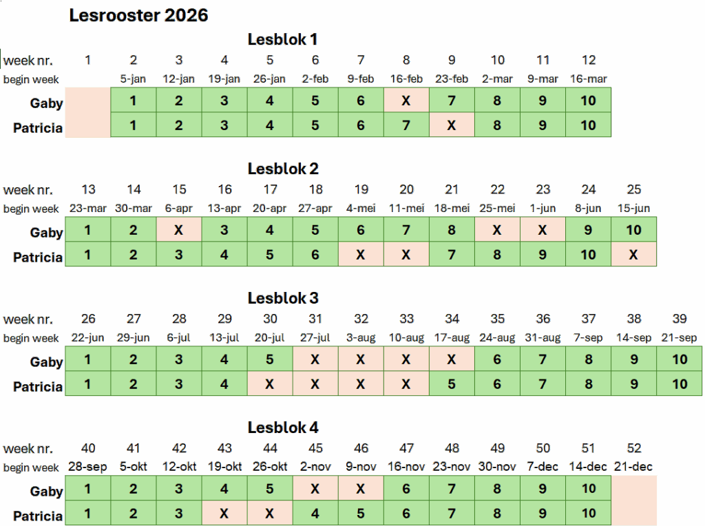 Het jaar is ingedeeld in 4 lesblokken met elk 10 lesweken. โผ๏ธWk4 en wk5 vallen uit, daarvoor in de plaats begint de les al in wk1 en wk8 (voorjaarsvakantie) โผ๏ธ